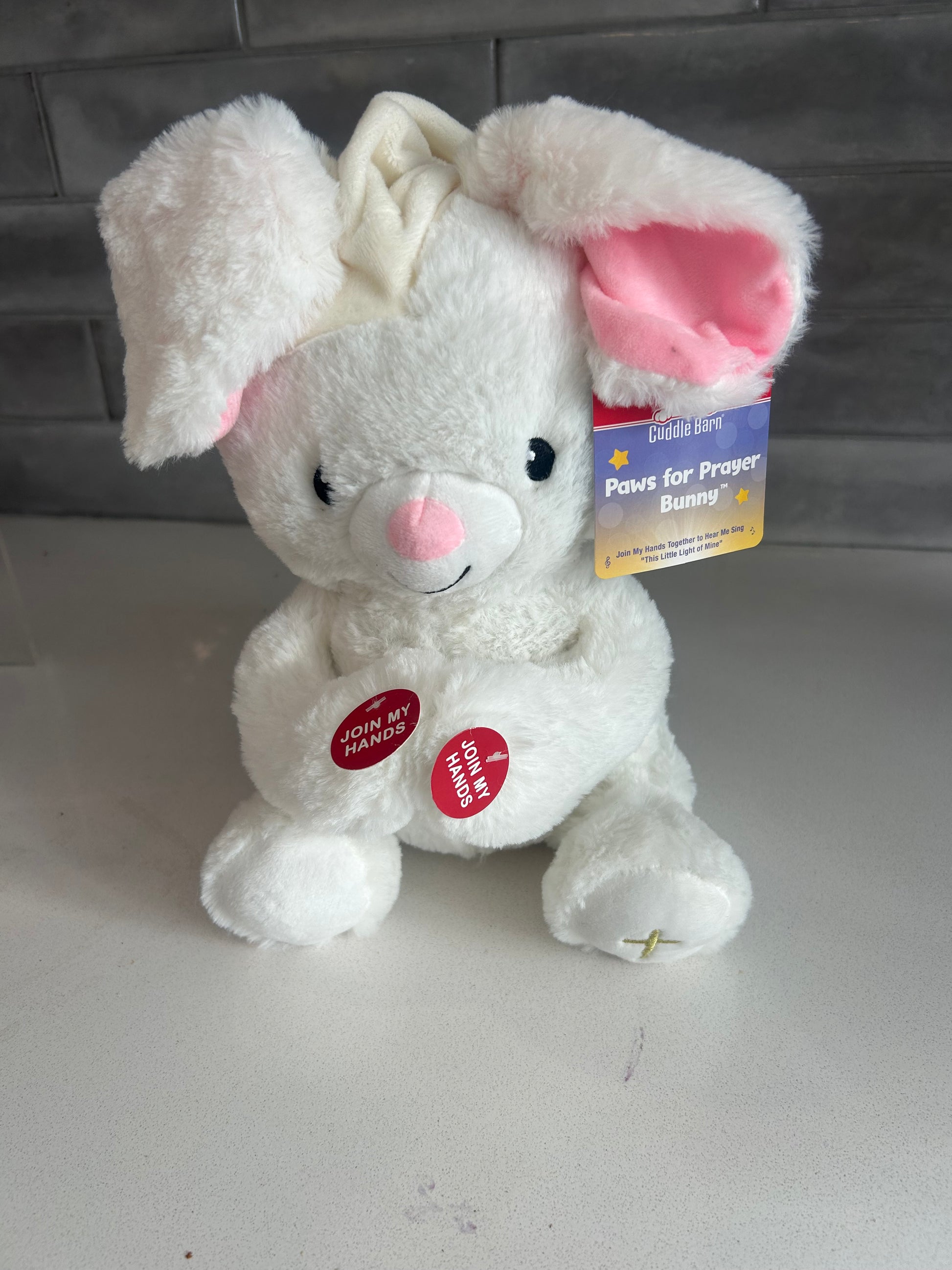 Join my hands together to hear me sing “ This little light of mine” and my cheeks to light up!!