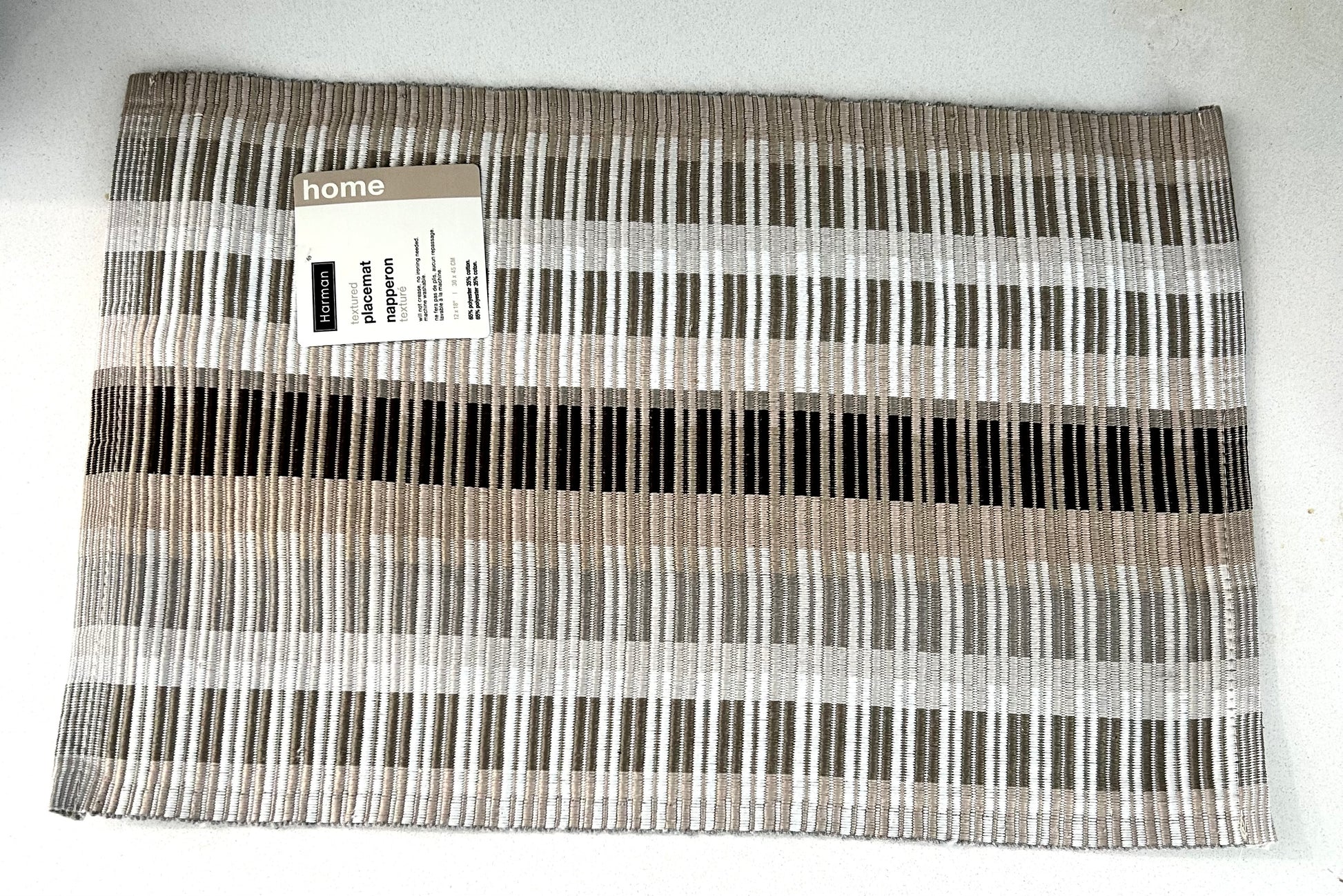 12” x 18” placemat. 65% polyester, 35% cotton. Will not crease, no ironing needed, machine washable. Tan.