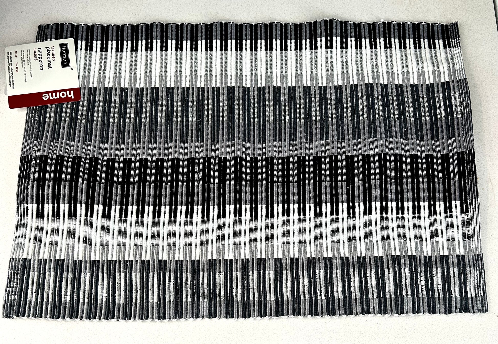 12” x 18” placemat. 55% polyester, 35% cotton., 10% metallic thread. Will not crease, no ironing needed, machine washable. Black.